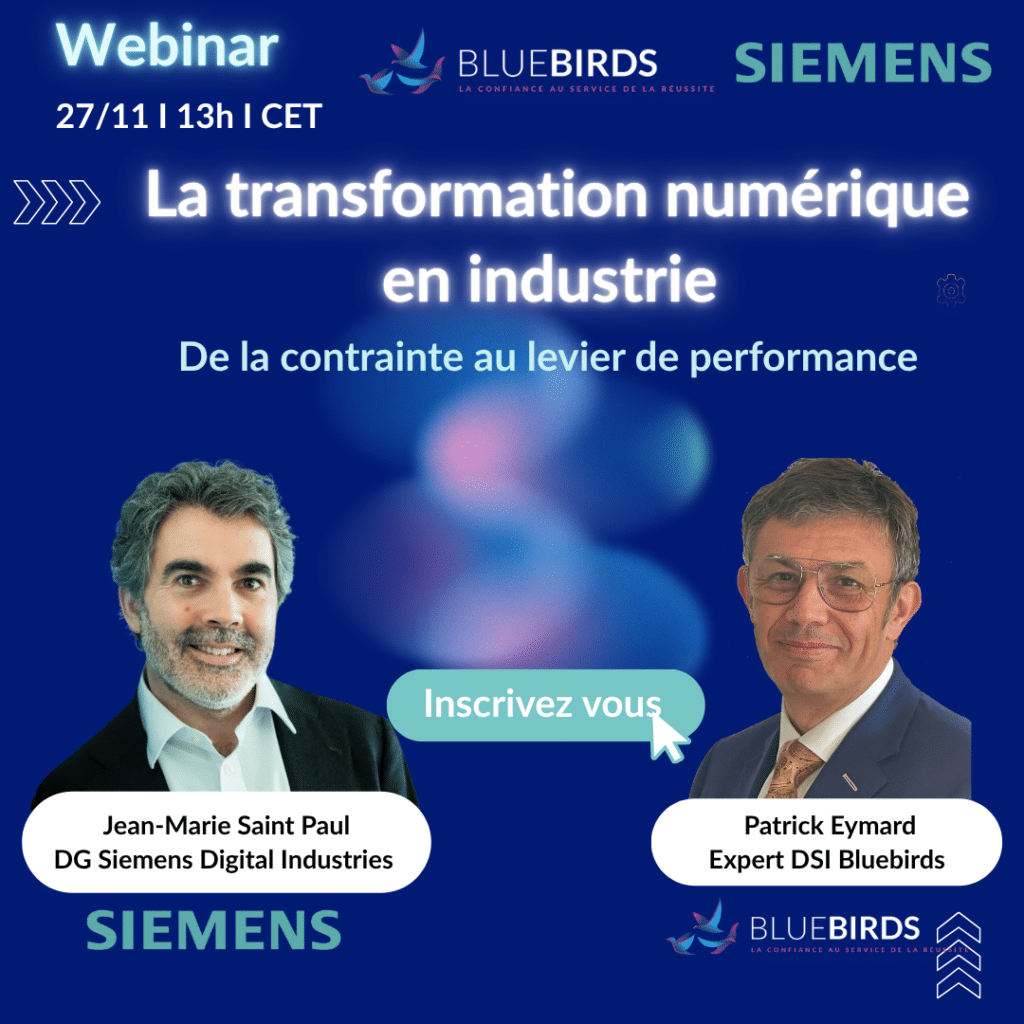 Le 27 novembre à 13h, BlueBirds et Siemens vous invitent à un webinar pour comprendre comment aligner technologie, organisation et humain pour réussir votre transformation.